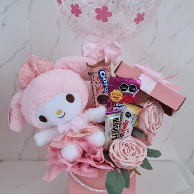 Arreglo en caja con peluche Melody rosa, globos rosas eternas y dulces