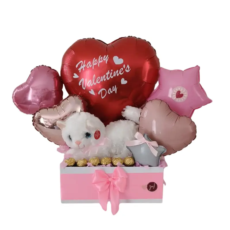 1 Globo central de corazón rojo metálico con la frase “Happy Valentine’s Day”.