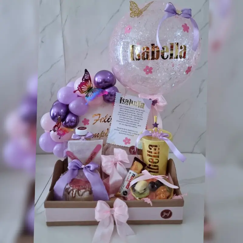 Charola perzonalizada con color a su gusto, jugo, fruta, pastelito, vaso o taza personalizada con nombre, cubiertos, chocolate (varia), puede escoger baguette, sandwich o croissants